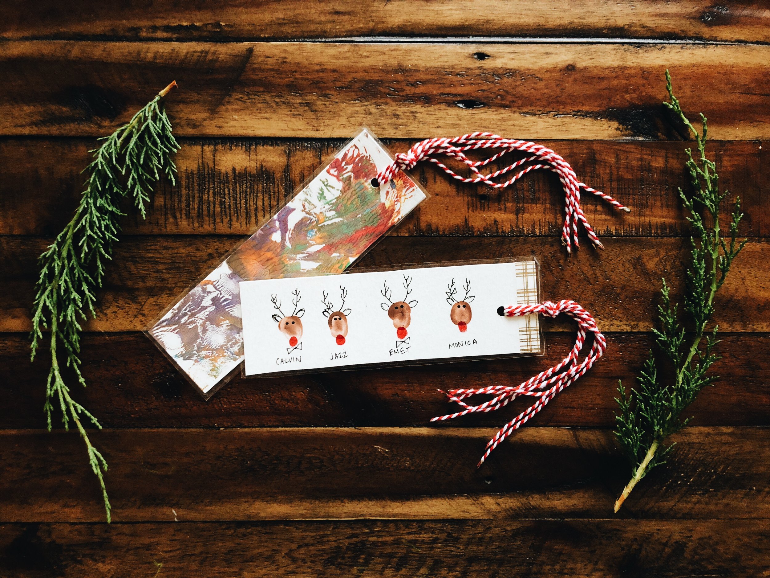 I made some bookmarks with Emet as an extra little gift for loved ones this year. Some were of Emet’s finger paint art and others were reindeer made with his thumbprint. You guys, I thought this project would never end. But I’m glad we did it.