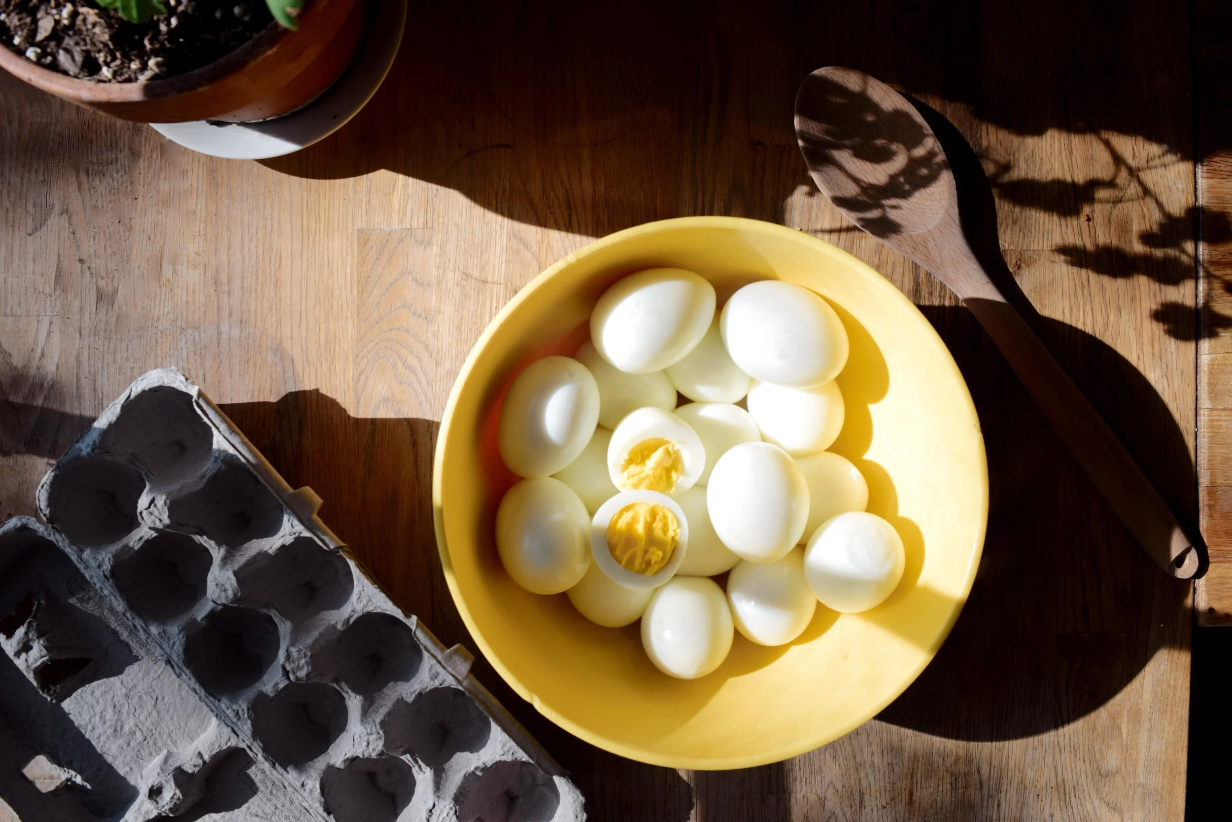 - Drain the hot water from the pan and cover the eggs with cool water. Immediately peel the eggs and place to the side.
