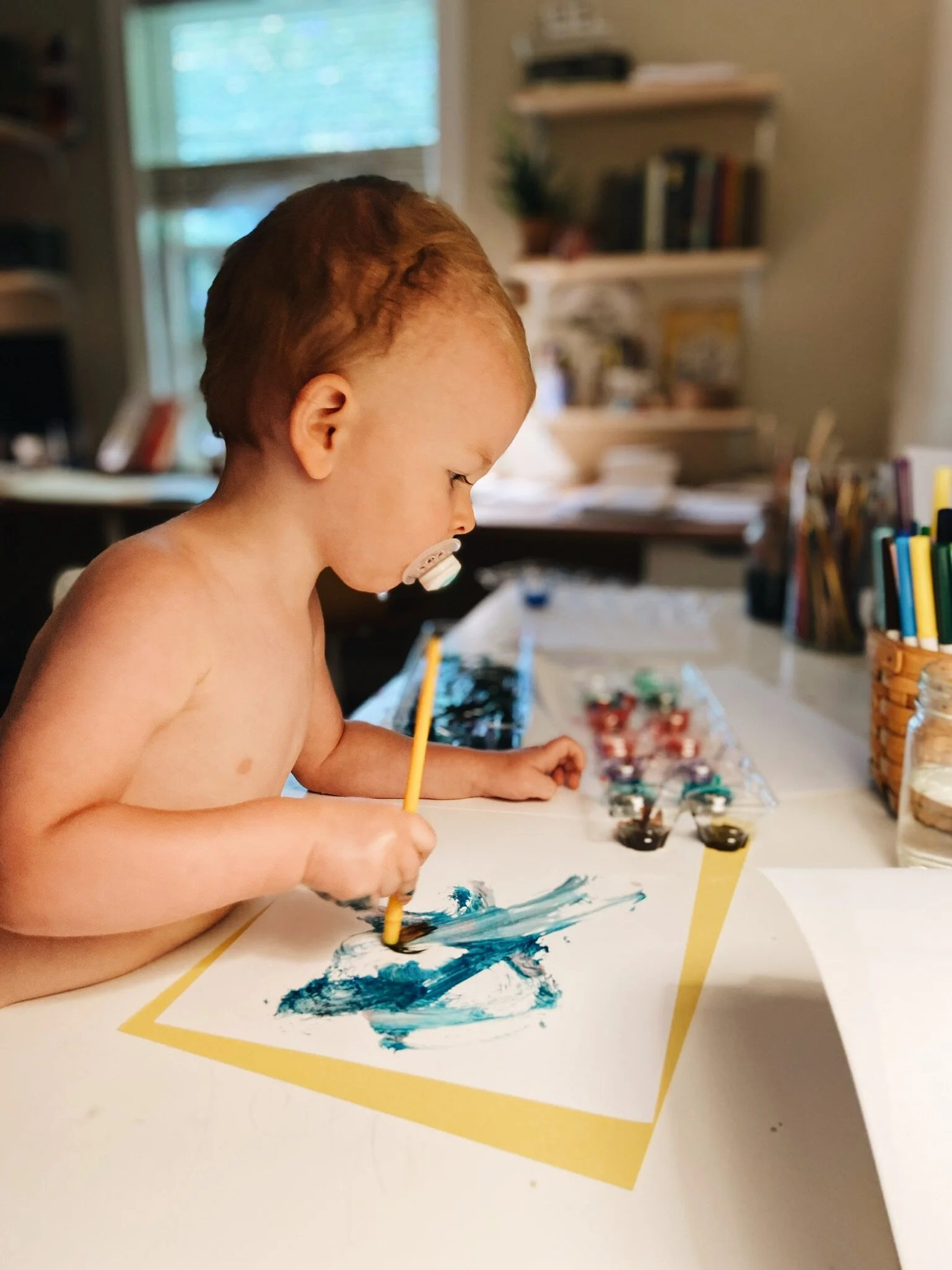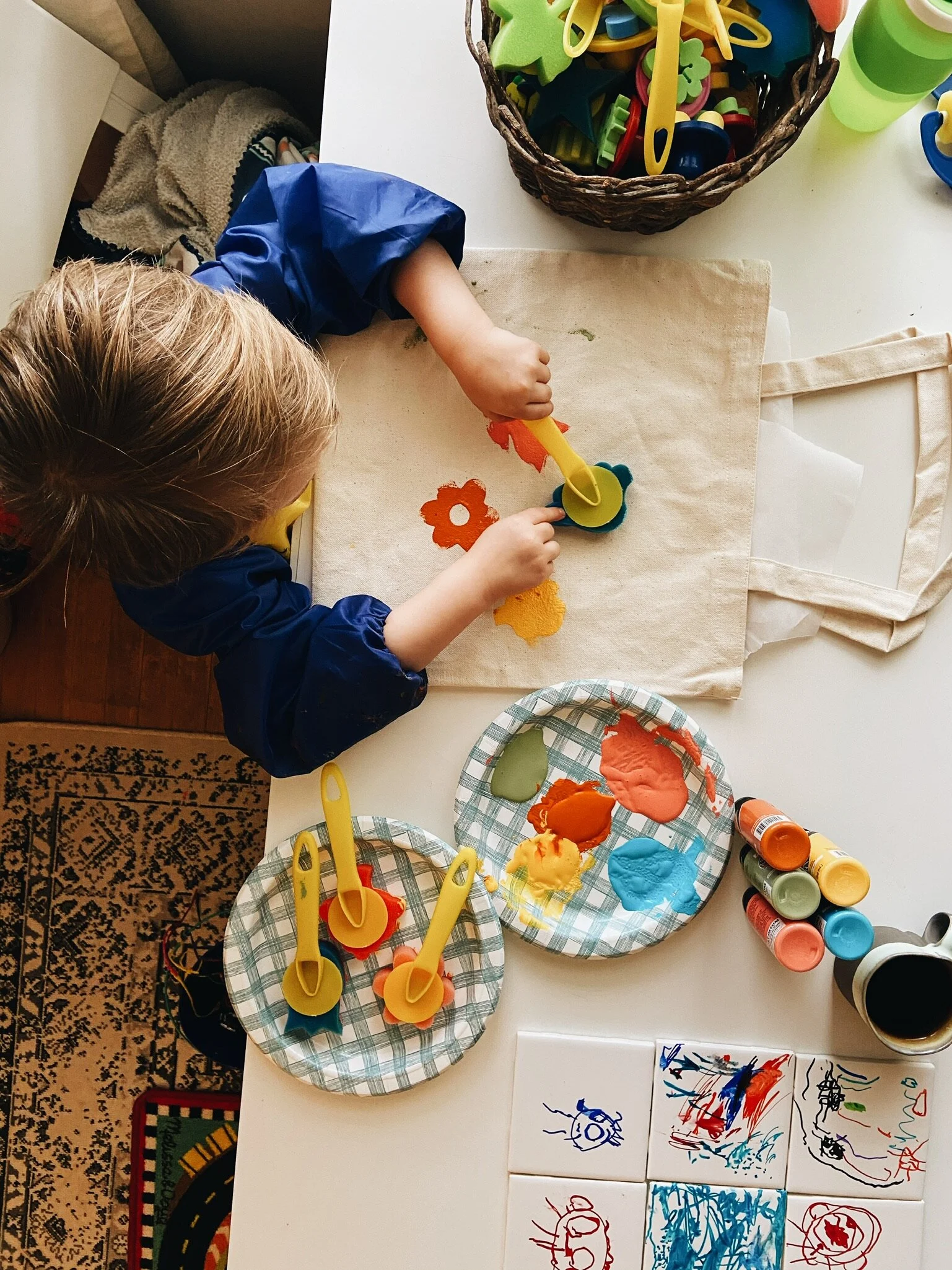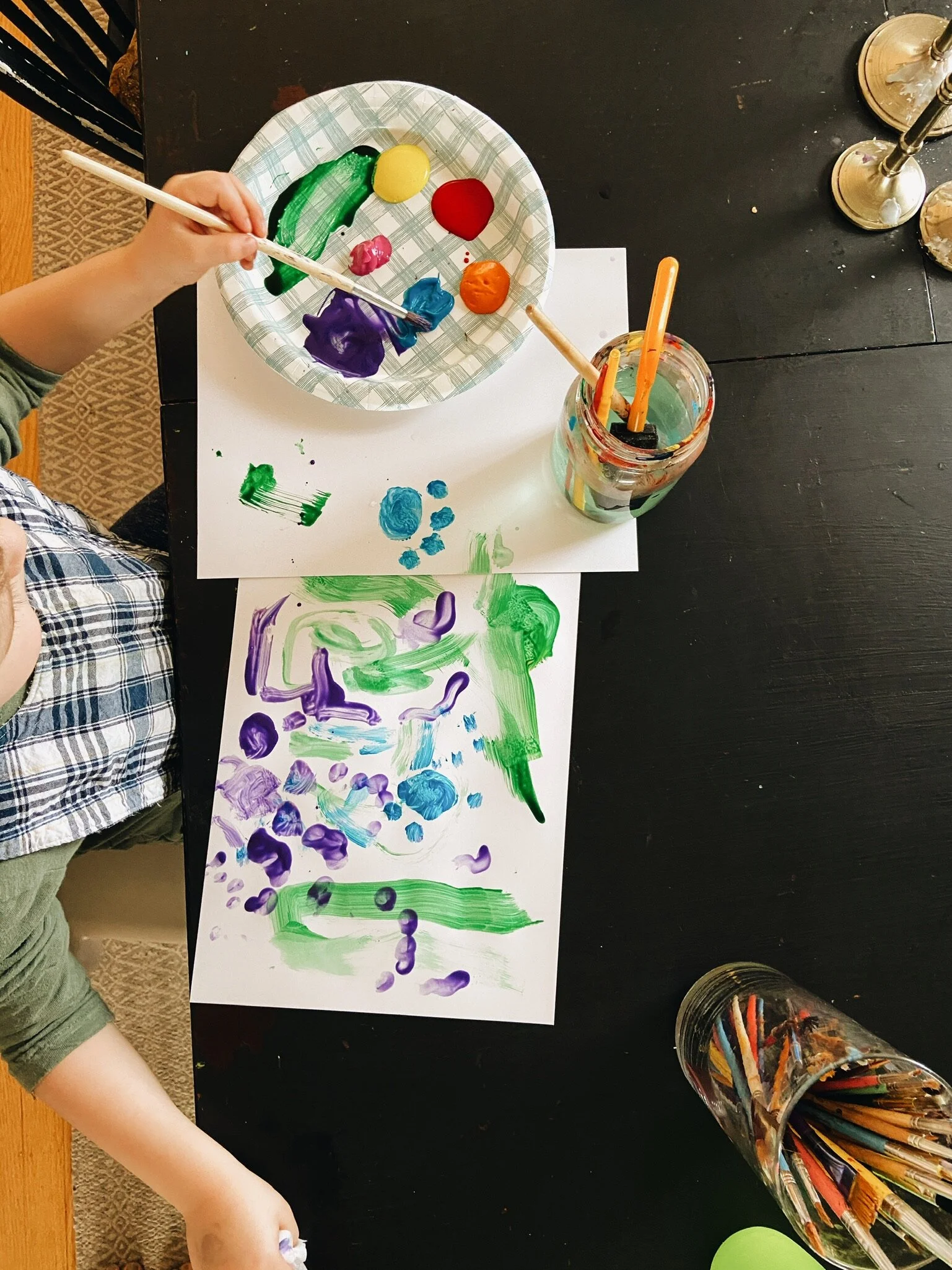 I think it’s so important to allow children the opportunity to explore their creativity. I like to do this in our home by providing time and space for them to freestyle paint. Freestyle painting is a fancy name for picking out your favorite paint colors and creating whatever you want. I love how it allows them to build their hand-to-eye coordination, communicate without using words, and feel the confidence of self-starting a project.